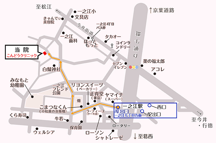 | 1. 一之江駅A1出口 エスカレーターで地上へ上がったら、右へ出てまっすぐ ※左手にロータリー、右手に花屋・モスバーガーなどがあります |